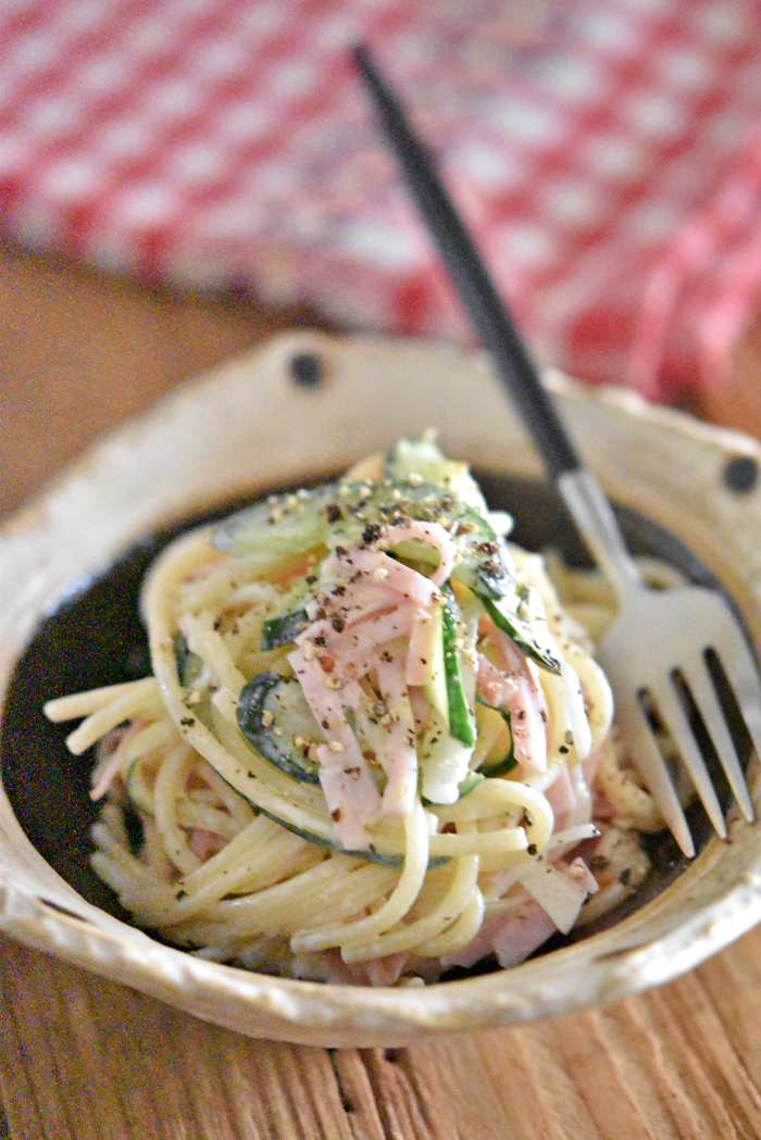 【さっぱりまろやかなサラスパ】 <材料・4~6人分> ・パスタ 100g ・きゅうり 1本 ・玉ねぎ 1/4個(約50g) ・ロースハム 4枚 ・塩 小さじ1/4 ●オリーブオイル 大さじ1/2 ●マヨネーズ 大さじ5 ●砂糖 小さじ1/2 <作り方・調理時間20分> ①鍋に1000ccのお水と小さじ1/2の塩(分量外)を入れ火にかけ、 沸騰したらパスタを入れて袋の表記通りゆでる。 ②パスタがゆで上がったらザルに上げて冷水で洗い、 パスタを手で押さえて水気をきる。 ③きゅうりは洗ってヘタを切り縦半分に切り、 斜め薄切りにして玉ねぎは薄切りにして塩をふり良く揉み込み10分置く。 ④ロースハムは細切りにする。保存容器に●を混ぜ合わせる。 ⑤ ③の水気をしっかり絞る。 ⑥●を混ぜ合わせた保存容器にロースハム、 きゅうり、玉ねぎを加えて良く混ぜ冷蔵庫で冷やす。 <コツ・ポイント> ・塩もみをしや野菜とパスタの水気はしっかり絞って下さいね。 <保存方法・保存期間> ・保存容器に入れ冷蔵保存で2日