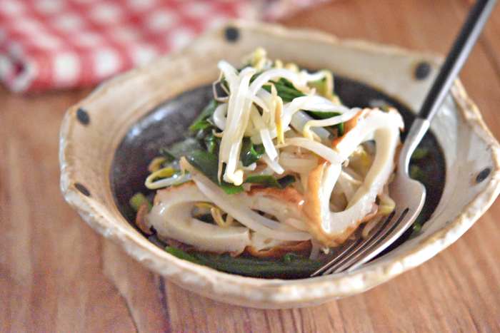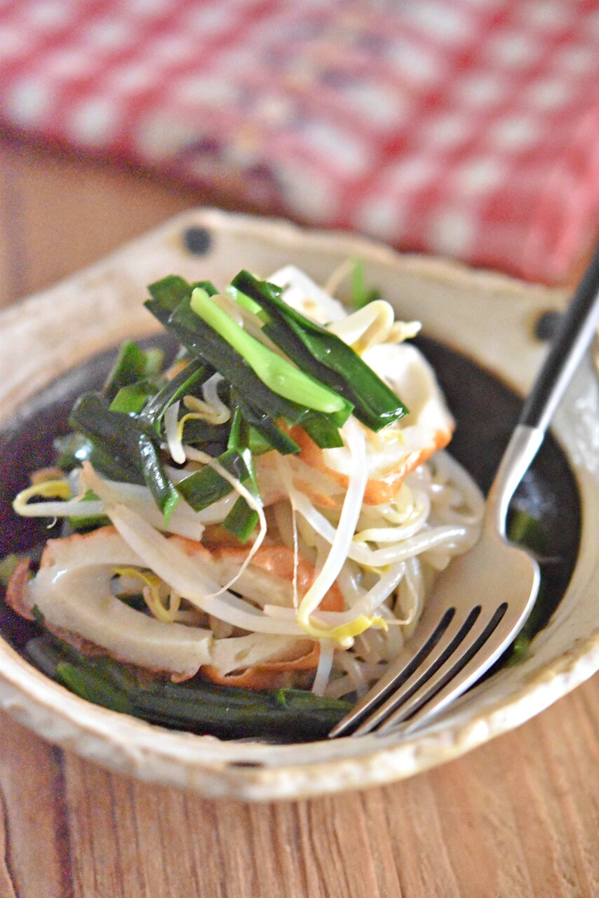【もやしとにらの竹輪ナムル】 <材料・4人分> ・もやし 1袋 ・にら 1/2束 ・竹輪 2本 ●ごま油 小さじ2 ●すりおろしにんにく 小さじ1 ●鶏がらスープの素 小さじ1/2 <作り方・調理時間10分> ①竹輪は斜め薄切り、にらは洗って水気をきり食べやすい長さに切る。 ②耐熱容器にもやし、にらの順に入れてラップをふんわりかけ
