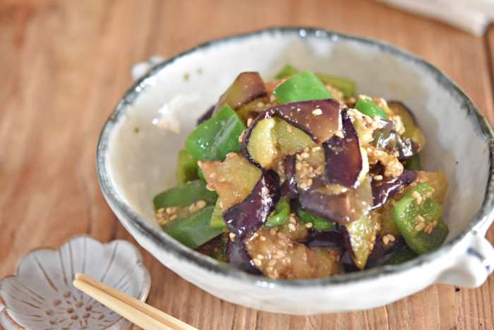 皆様おはようございます いつもご視聴ありがとうございます(^^♪ 今回の動画は、なすとピーマンのごま和えレシピのご紹介です。 野菜の和え物といえばゆでたり蒸したりするのが定番ですが、 今回はフライパンでこんがり焼いて和え物にするので奥深い美味しさ!! 野菜をじっくり焼いているので旨味があっぷ!! 野菜だけなのにご飯がもりもり進む1品です。 ぜひお試し下さいね(^^♪