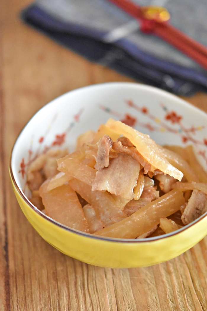 【生姜たっぷり豚バラ大根】 <材料・4人分> ・大根 1/5本(約300g) ・生姜 10g ・豚バラ薄切り肉 120g ・サラダ油 小さじ1 ●水 300cc ●酒・みりん・醤油 各大さじ1 ●顆粒だしの素・砂糖 各小さじ1 <作り方・調理時間20分> ①大根は皮をむき拍子切りにする。 生姜は千切りにする。 豚バラ薄切り肉は3cm幅に切る。 ●を容器に混ぜ合わせる。 ②フライパンにサラダ油をひき中火にかけ、 フライパンが温まったら豚バラ薄切り肉と 生姜を入れて焼き色がつくまで炒める。 ③豚バラ薄切り肉に焼き色がついたら大根を加えて、 中火で2分ほど炒め●を加えて沸騰したら蓋をして中火で10分煮る。 ④10分煮たら蓋を取り、 強火にして煮汁が少し残る程度まで炒めながら煮詰める。 <コツ・ポイント> ・④の工程では、煮詰める事で少ない調味料でもしっかりとした味になり、
