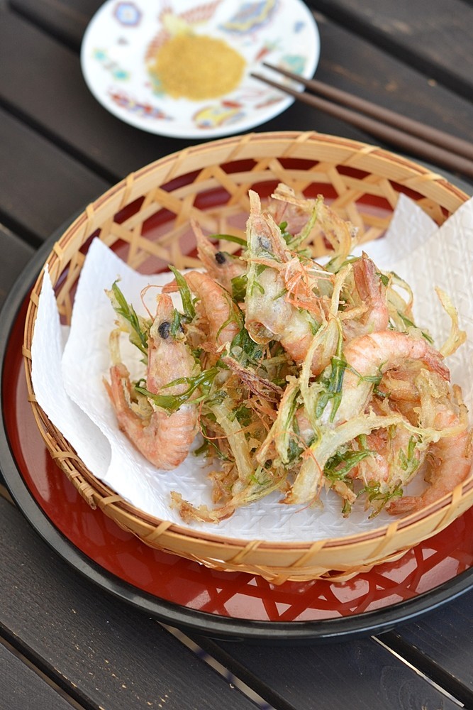 このレシピは小エビと玉ねぎと水菜ですが、