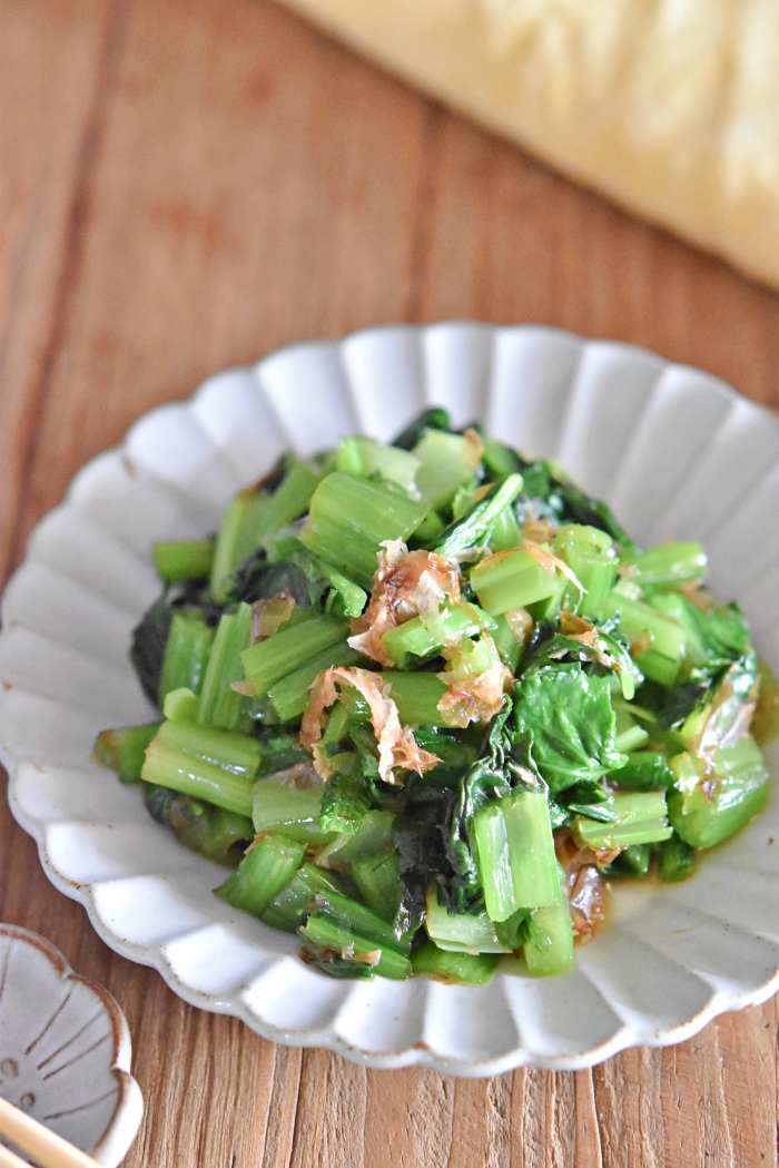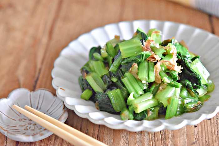 【小松菜のやみつきおかか和え】 <材料・4人分> ・小松菜 3束(約150g) ●鶏がらスープの素・醤油 各小さじ1/2 ●ごま油 小さじ2 ●かつお節 2g <作り方・調理時間15分> ①小松菜は根元を切り落とし洗う。 茎の部分は土がついてる事が多いので、特にしっかり洗って下さいね。 ②洗った小松菜は茎を細かく切り、葉の部分も細かく切る。 ③耐熱容器に茎、葉の部分の順に入れラップをふんわりかけ600w4分レンジで加熱してラップを外して粗熱を取る。 ④粗熱が取れたらペーパーで水気を拭き取り●を加えて良く混ぜ合わせる。 <コツ・ポイント> ・葉の部分は縦半分に切って重ねてから細かく切るといいですよ。 ・レンジ加熱の後はペーパーで水気をしっかり拭き取って下さいね。 <保存方法・保存期間> ・保存容器に入れ冷蔵保存で2日