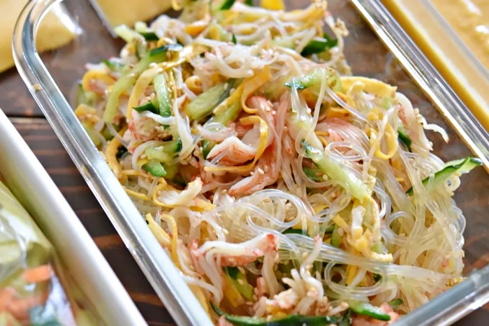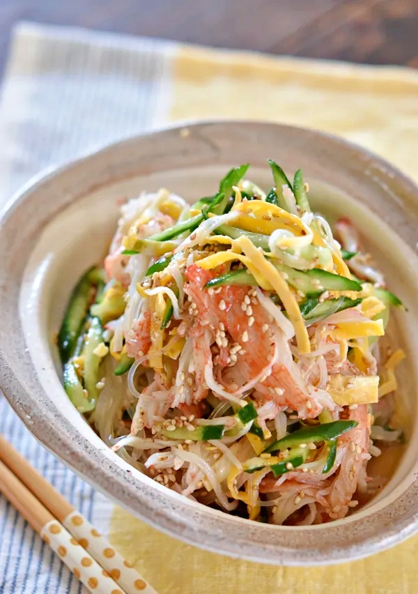 【具だくさんごちそう中華風春雨サラダ】 <材料・4人分> ・きゅうり 1本 ・塩 ひとつまみ ・春雨 30g ・かにかま 80g ・いりごま 大さじ1 ●卵 1個 ●砂糖 ひとつまみ ★砂糖・醤油 各大さじ1 ★酢 大さじ2 ★ごま油 小さじ2 <作り方・調理時間20分> ①春雨は袋の表記通りにゆでてザルに上げ、流水で洗ってぬめりを取り、 手で押さえて水気をきる。 ②フライパンを強火で温め、混ぜ合わせた●を流し入れ フライパンを傾けながら広げ火を止め、縁が乾くまで置き細切りにする。 ③きゅうりは千切りにして塩をふり、しんなりしたら水気を絞る。 ④ボウルに★を入れて良く混ぜ合わせ、①②③いりごま、 手でさいたかにかまを加えて良く混ぜ合わせる。 <コツ・ポイント> ・春雨ときゅうりの水気は、しっかり絞って下さいね。 <保存方法・保存期間> ・保存容器に入れ冷蔵保存で3日