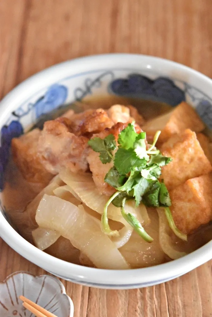 【新玉ねぎと鶏もも肉のすき煮】 <材料・4人分> ・新玉ねぎ 1個(約300g) ・厚揚げ豆腐 1/2丁(約130g) ・鶏もも肉 1枚(約300g) ・酒 大さじ1/2 ・薄力粉 大さじ3 ・サラダ油 大さじ1 ◎水 200cc ◎酒・みりん・醤油 各大さじ1 ◎顆粒だしの素・砂糖 各小さじ1 <作り方・調理時間20分> ①新玉ねぎは皮をむいてヘタを切り、 縦半分に切り芯を取り繊維を断ち切るようにして1cm幅に切る。 ②厚揚げ豆腐はひとくちサイズに切る。 鶏もも肉はペーパーで水気を拭き取り、一口大に切り酒を揉み込む。 ③◎を容器に混ぜ合わせる。鶏もも肉に薄力粉をまんべんなくまぶす。 ④フライパンにサラダ油をひき中火で温め、 新玉ねぎを入れてしんなりするまで炒めフライパンの隅に寄せる。 ⑤鶏もも肉の皮目を下にして並べ焼き色がつくまで焼き、 焼き色がついたら裏返し厚揚げ豆腐、 ◎を加え沸騰したら蓋をして中火で8分煮る。 <コツ・ポイント> ・鶏もも肉に筋や余分な脂があれば取り除いて下さいね。 ・新玉ねぎはじっくり炒める事で甘みが増します。