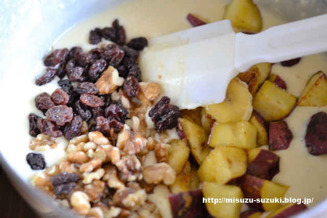 混ぜ合わせ、くるみ、②、レーズンを加え、